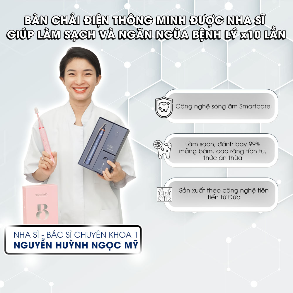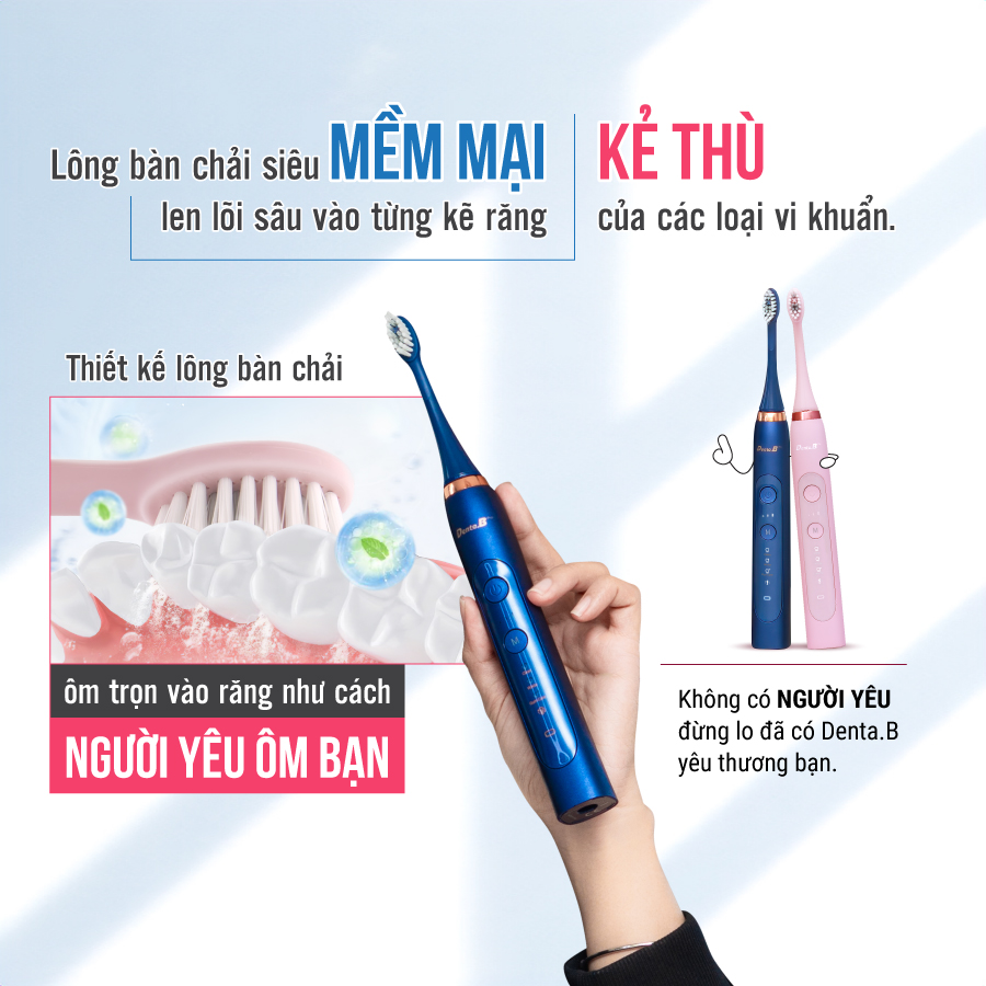 - Bàn chải điện DentaB là bàn chải tích hợp 3 mức độ x 3 chế độ (clean - làm sạch, white - làm trắng, gum - chăm sóc nướu) tùy chọn sử dụng theo nhu cầu.