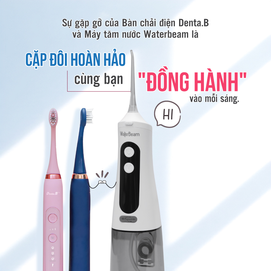 COMBO SẢN PHẨM BAO GỒM: 1 MÁY TĂM NƯỚC WATERBEAM 9 CẤP ĐỘ DUNG TÍCH 350ML & 1 BÀN CHẢI ĐIỆN DENTA.B PRO 9 CẤP ĐỘ LÀM SẠCH BẰNG SÓNG ÂM