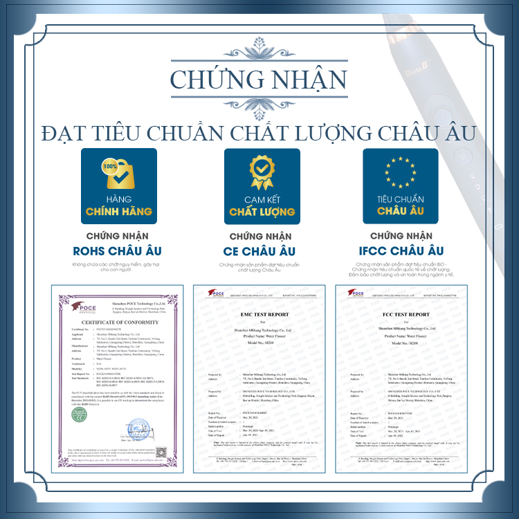 - Được chứng nhận theo tiêu chuẩn Đức CE và RoHS về độ bền, an toàn, chống cháy nổ khi sử dụng, chứng nhận thiết bị điện và điện tử không chứa chất gây nguy hiểm, gây ảnh hưởng đến sức khỏe do Châu Âu ban hành.