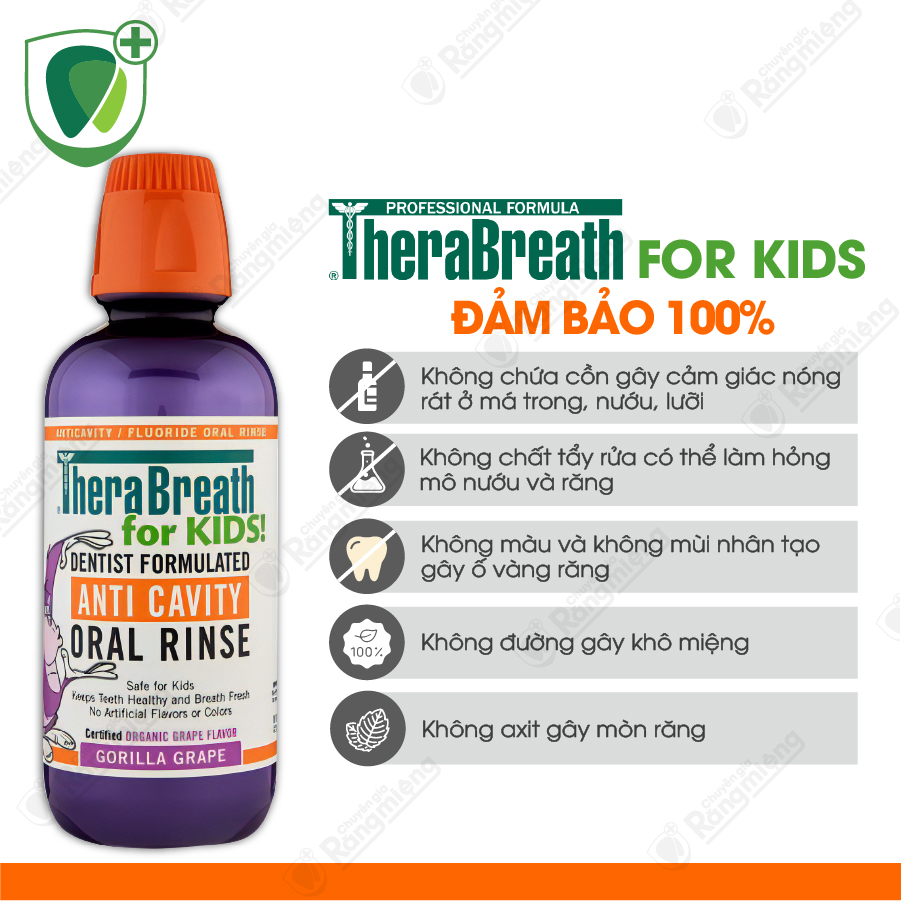*Trong thành phần nước súc miệng TheraBreath for Kids! không chứa: không chứa cồn, không chứa sodium lauryl sulfate (một chất tẩy rửa mạnh), không đường (chất gây khô miệng), không màu và không mùi nhân tạo (chất làm răng dễ bị ố màu), không axit (chất gây mòn răng).
